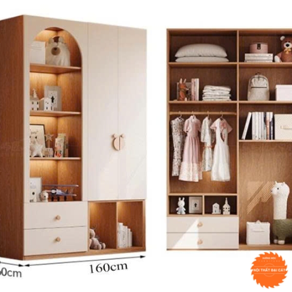 Tủ gỗ quần áo trẻ em được thiết kế các ngăn chứa đồ, kéo ra kéo vào thuận tiện. Bạn có thể dễ dàng phân loại từng ngăn để đồ như ngăn đựng áo, ngăn đựng quần, ngăn để các vật dụng thời trang khác,… vừa là để tạo sự gọn gàng ngăn nắp, vừa giúp bé dễ dàng khi lấy đồ của mình.