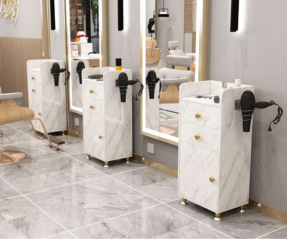 Tủ đựng có kích thước nhỏ gọn, phù hợp cho mọi diện tích, đặc biệt là những tiệm tóc nhỏ. Loại tủ này có ngăn kéo và thường đặt tại khu vực làm tóc để thuận tiện khi lấy sản phẩm, thiết kế cánh kín giữ cho sản phẩm luôn sạch, không bị bám dính tóc.
